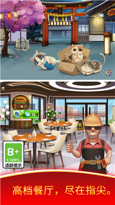 1、全球餐厅模拟经营系统,玩家可逐步解锁八大主题场景,从法式甜品屋到日式居酒屋应有尽有