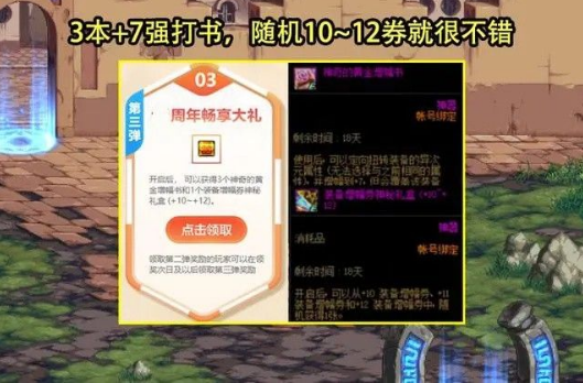 第三阶段奖励体系大概率维持原有框架,包含三本神圣增幅典籍与随机增幅券秘盒的经典组合。该组合中增幅典籍可确保装备红字基础,而秘盒开启的+10至+12随机增幅券虽存在概率差异,仍能为装备打造提供关键助力。特别是对于冲击高阶增幅的玩家,该资源包可显著降低强化成本,建议优先作用于核心装备的打造工程。