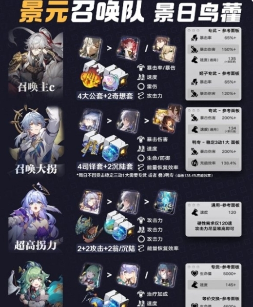 装备选择方面,景元推荐使用【神机千狩】四件套强化召唤物伤害,星期日适配【苍穹幕落】提升能量恢复速度,知更鸟选择【星海巡游】增强辅助效果持续时间,霍霍配备【生生不息】套装提高治疗量。武器方面优先选择专属装备,次选同类属性替代品。