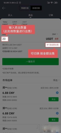 在USDT交易区,用户可自由选择按数量或金额出售。输入具体数值后,系统将自动计算对应金额,确认无误后点击"一键卖币"进入下一步。