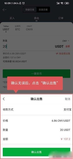 仔细核对订单详情包含的币种数量、兑换汇率、到账金额等关键信息,确认所有数据准确后点击"确认出售"按钮提交交易申请。
