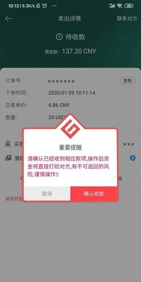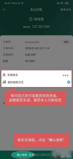 确认支付宝账户实际到账后,返回交易界面点击"确认收款"完成最终交割。系统将自动更新订单状态为"已完成",对应数字货币将转入买方账户。