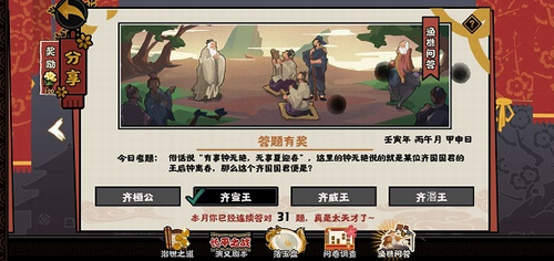 1.本日题目取材于典故"有事钟无艳,无事夏迎春",考查玩家对春秋战国时期齐国历史的掌握。题目明确指出钟离春作为齐国某代君主的王后,要求玩家判断对应的君主身份。